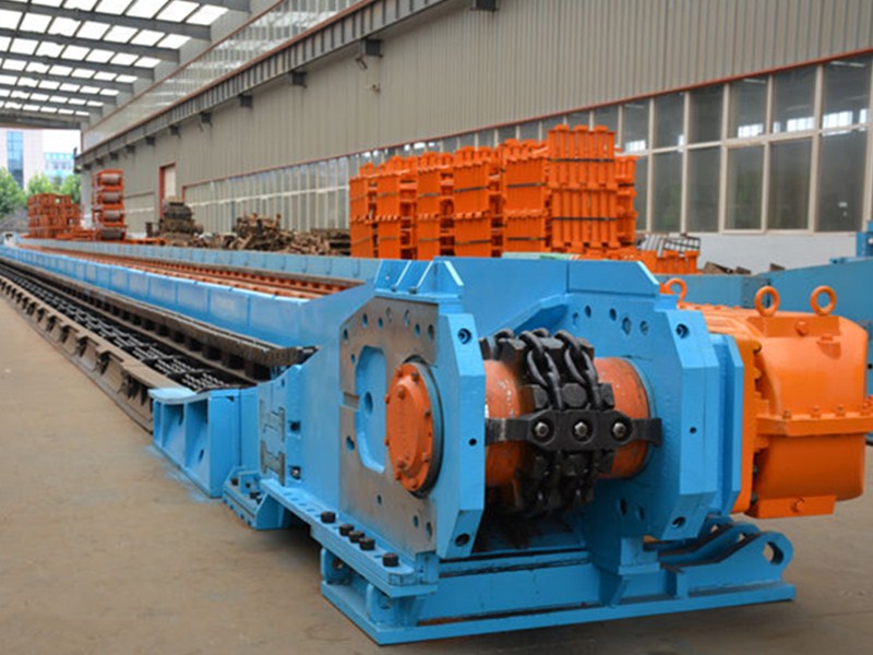此外,還有供推移輸送機用的液壓千斤頂裝置和緊鏈時用的緊鏈器等附屬部件。機頭部由機頭架、電動機、液力耦合器、減速器及鏈輪等件組成。中部由過渡槽、中部槽、鏈條和刮板等件組成。機尾部是供刮板鏈返回的裝置。重型刮板輸送機的機尾與機頭一樣,也設有動力傳動裝置,從安設的位置來區分叫上機頭與下機頭。