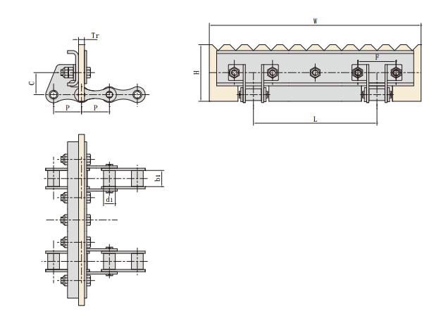 主要規格型號有:ZGS38F47(節距38mm,滾子直徑16.0mm,內節內寬22.00mm,橡膠附板尺寸W480.0mm,L360.0mm,H77.0mm,F52.0mm,Tr8.0mm)