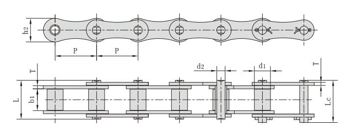 鏈號 節(jié)距 滾子直徑 內(nèi)節(jié)內(nèi)寬 銷軸直徑 銷軸長度 鏈板尺寸 抗拉強度 每米長重