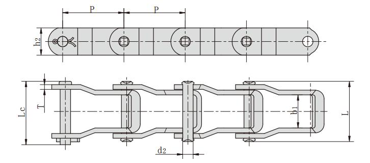 鏈號 節距 內節內寬 銷軸直徑 銷軸長度 鏈板高度 鏈板厚度 抗拉強度 每米長重