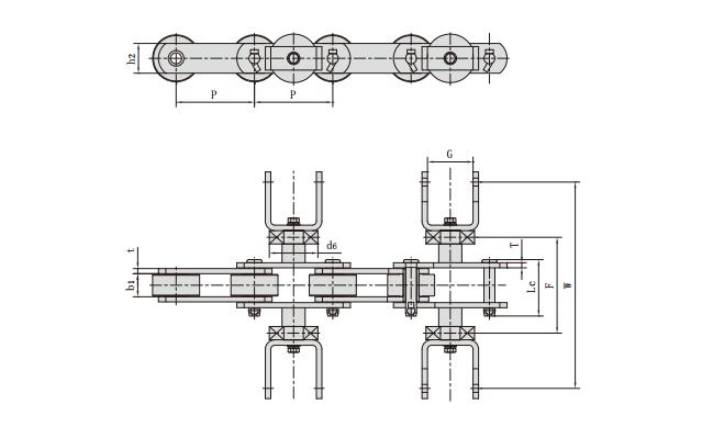 鏈號 節(jié)距 滾子直徑 內(nèi)節(jié)內(nèi)寬 銷軸直徑 銷軸長度 鏈板高度 鏈板厚度 附件尺寸 抗拉強(qiáng)度