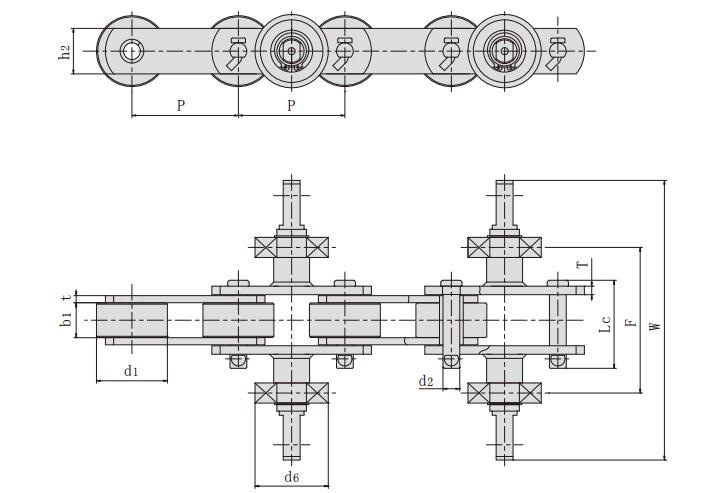鏈號 節距 滾子直徑 內節內寬 銷軸直徑 銷軸長度 鏈板高度 鏈板厚度 附件尺寸 抗拉強度