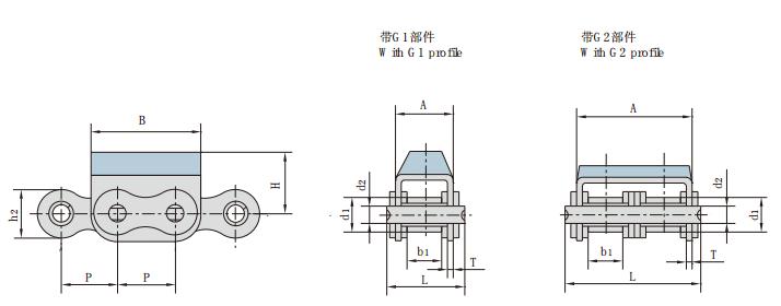鏈號 節距 滾子直徑 內節內寬 銷軸直徑 銷軸長度 附板、鏈板尺寸 抗拉強度 每米長重