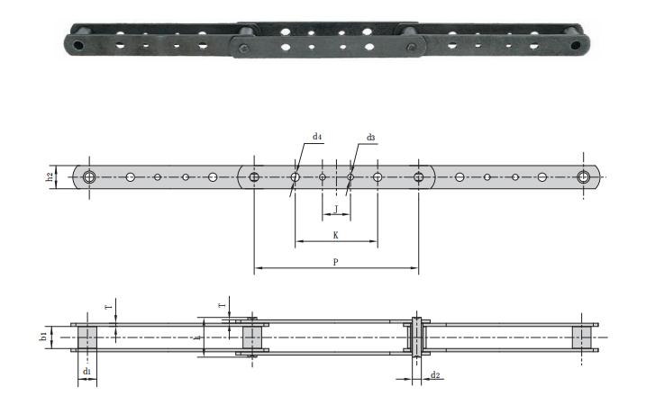 | 鏈號 | 節距 | 滾子直徑 | 內節內寬 | 銷軸尺寸 | 鏈板尺寸 | 鏈板厚度 | 抗拉強度 | 平均抗拉強度 | 每米長重 | |||||