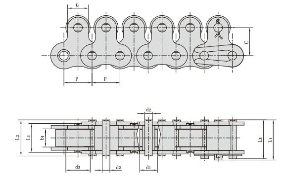 鏈號 節距 滾子直徑 內節內寬 銷軸直徑 銷軸長度 附板尺寸 抗拉強度 每米長重